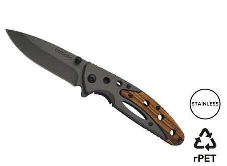 Klappbares Messer mit Klinge aus rostfreiem 420er Edelstahl mit Titanbeschichtung. Montage mit Torx Schrauben. Griff aus Zebranoholz. Einhändiges Öffnen/ Schließen mit einem Liner-Lock Sicherheitsmechanismus. Gürtelclip. Wird in einen meliertem grauen Etui aus RPET geliefert.