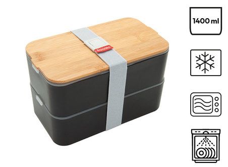 Double compartment lunch box. Two polypropylene containers and two polyethylene separators with silicone seals and vacuum system for a perfect airtight sealing. Bamboo lid. Without the lid, the food container is dishwasher safe (max 50°C), freezer safe and microwave safe (max 100°C and 2 minutes). Capacity: 1,4 L.
