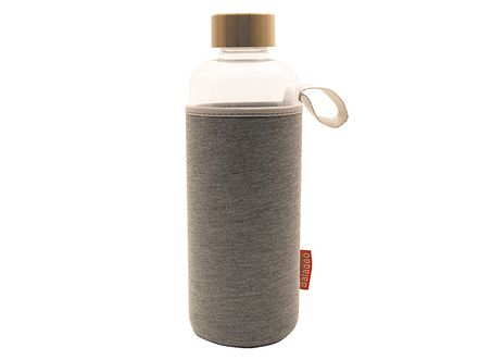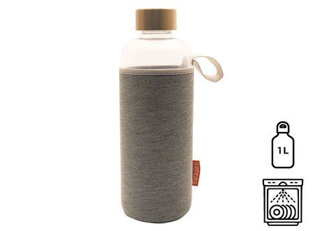 Single wall borosilicate glass. Bamboo cap with a silicone seal. Without the cap, dishwasher safe. Heather grey neoprene protective pouch. Capacity: 1 L.