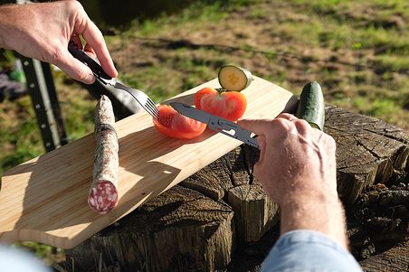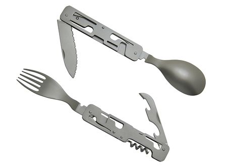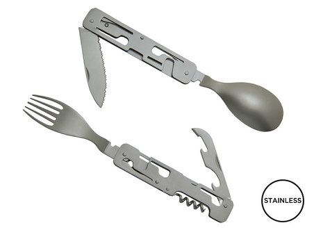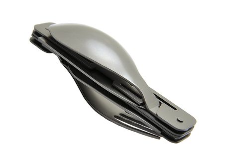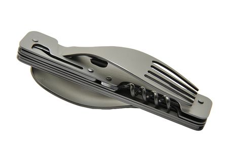 Food-grade 420 stainless steel folding travel cutlery set with titanium coating. System to split the product into two parts and form a fork and a knife (or a spoon). 6 functions: micro-serrated blade knife, fork, spoon, bottle opener, can opener, corkscrew with 4 stainless steel spirals. Anthracite grey neoprene pouch included.