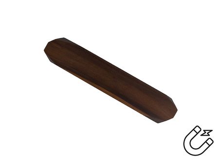 Acacia wood and Ferrite magnets. To hang on the wall for knives and other metallic items. 30cm long.