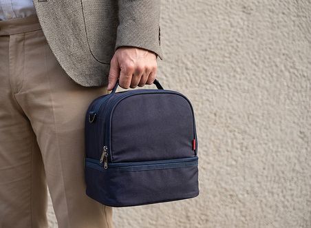 Thermotasche mit doppeltem Fach aus Polycotton 160g/m². Maße des oberen Fachs: 25x20x16cm. Maße des unteren Fachs: 25x20x9cm. Kompatibel mit allen unseren Bento-Modellen. Isolierende 3mm dicke Auskleidung. Schultergurt. Möglichkeit eine Visitenkarte einzufügen. Verstärkte und gepolsterte Griffe für einen besseren Halt. Reißverschluss. Fassungsvermögen: 12,5 L.