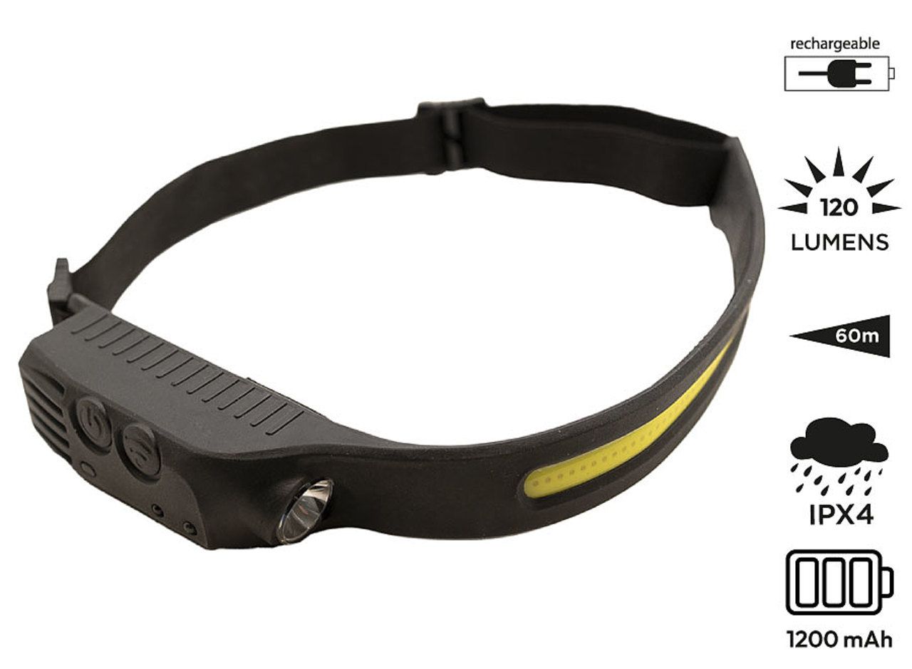 4 Beleuchtungsmodi: XPE-LED (100 % oder 'Eco'-Modus) und weißes COB (100 % oder 'Eco'-Modus). Integrierter Bewegungssensor für berührungsloses Ein- und Ausschalten. Gehäuse aus ABS-Kunststoff und Silikon. Bequemes elastisches Stirnband aus Soft-Touch und Silikon. Funktioniert mit einem 1200-mAh-Akku. Wird mit einem USB-C-Kabel geliefert. XPE-LED-Leistung: 3 W (80 Lumens). XPE-LED-Strahllänge: 60 m. XPE-LED Autonomie: 5h-5,5h. COB-Leistung: 3W (120 Lumens). COB-Strahllänge: 30 m. COB Autonomie: 2h. Wasserdichtigkeitsgrad: IPX-4.