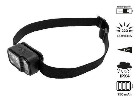 4 Beleuchtungsmodi: LED XPG (100 % oder 'Eco'-Modus), LED SMD (warmes Licht) oder blinkendes rotes LED-Licht. Integrierter Bewegungssensor zum Ein- und Ausschalten ohne Berührung. Ladeanzeige in %. Einstellbarer Lichtstrahl. Gehäuse aus ABS-Kunststoff. Elastisches und komfortables Soft-Touch-Band. Funktioniert mit einem wiederaufladbaren 750-mAh-Akku. Wird mit einem USB-C-Ladekabel geliefert. Leistung der LED XPG: 5W (220 Lumens). Reichweite des Lichtstrahls der LED XPG: 50 m. Akkulaufzeit der LED XPG: 2–4 Stunden. Wasserbeständigkeitsklasse: IPX-4.