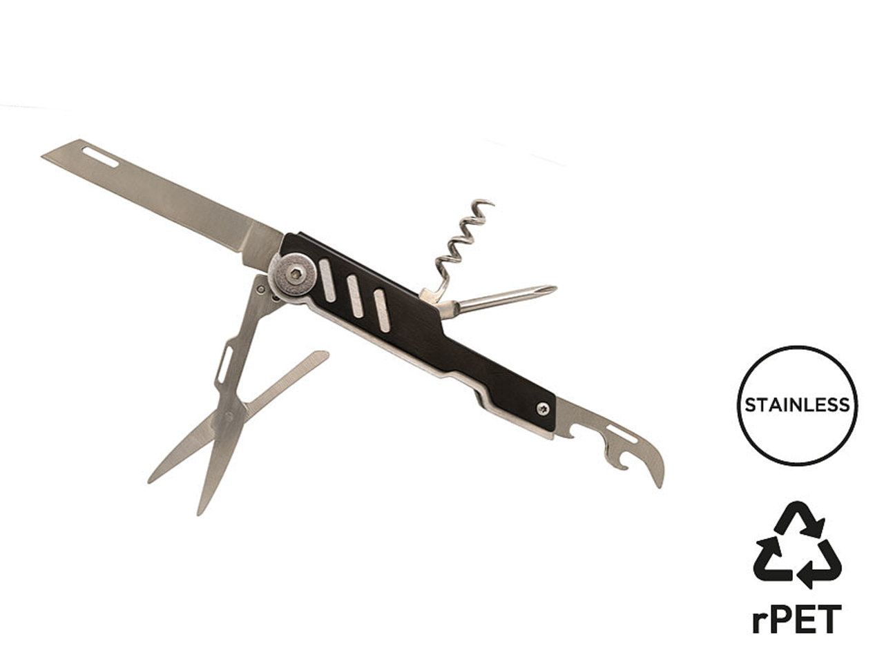 Elemente komplett aus hochbeständigem Edelstahl (2CR13). Griff aus Aluminium. Torx-Schraubmontage. 6 Funktionen: Messer, Flaschenöffner, Dosenöffner, Kreuzschlitzschraubendreher, Schere, Korkenzieher mit 4 Spiralen. Lochung für Ring oder Kordel. Lieferung in einem graumelierten RPET-Etui.
