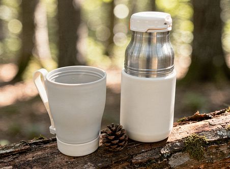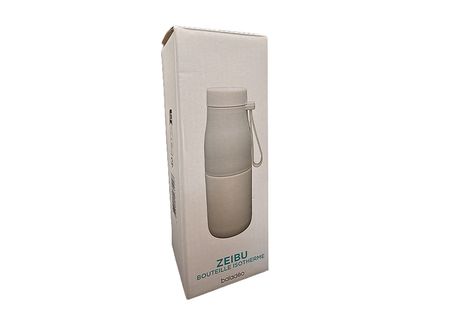 Doppelwandige Isolierung mit Innenwand aus 304-Edelstahl (lebensmittelecht) und Außenwand aus 201-Edelstahl mit Polystyrol- und Polypropylenbeschichtung. Auslaufsicherer Schraubverschluss mit Druckknopf-Öffnungssystem. Integrierter Teefilter im Deckel. Separater Becher (mit rutschfester Silikonbasis), der zum Transport auf die Flasche geschraubt wird. Silikon-Handschlaufe. Fassungsvermögen: 400 ml.