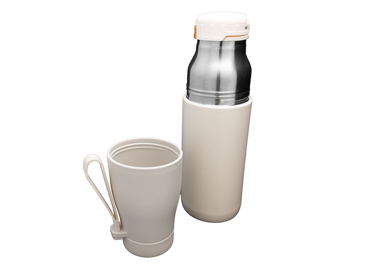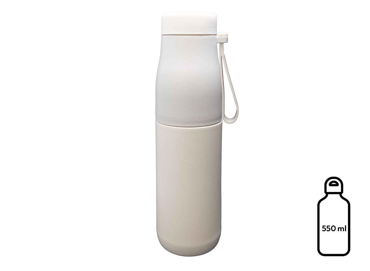 Doppelwandige Isolierung mit Innenwand aus 304-Edelstahl (lebensmittelecht) und Außenwand aus 201-Edelstahl mit Polystyrol- und Polypropylenbeschichtung. Auslaufsicherer Schraubverschluss mit Druckknopf-Öffnungssystem. Integrierter Teefilter im Deckel. Separater Becher (mit rutschfester Silikonbasis), der zum Transport auf die Flasche geschraubt wird. Silikon-Handschlaufe. Fassungsvermögen: 550 ml.