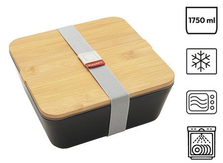 Lunchbox mit einem Fach. Behälter aus Polypropylen und Trennwand aus Polyethylen mit Silikondichtungen und Vakuumverschlusssystem für perfekte Abdichtung. Unterteiler Einsatz aus Polypropylen. Deckel aus Bambus. Kompatibel (ohne Deckel) mit Spülmaschine (max. 50 °C), Gefrierschrank und Mikrowelle (max. 100° C und 2 Minuten). Fassungsvermögen: 1,75.