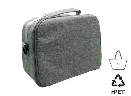 Isotherme Tasche aus meliertem Wulong-Gewebe RPET. Kompatibel mit all unseren Bento-Modellen. Isolierende Schicht mit 3 mm Dicke. Schulterriemen. Möglichkeit, eine Visitenkarte einzufügen. Verstärkter und gepolsterter Griff für besseren Halt. Reißverschluss. Fassungsvermögen: 8 L.