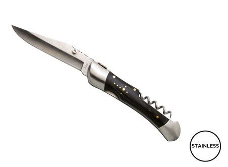Klappbares Messer mit Klinge aus rostfreiem 420er Edelstahl. Griff aus schwarzem Stamina-Holz. 2 geschmiedete Heftbacken aus Edelstahl. Verzierte Feder. Korkenzieher mit 4 Spiralen aus rostfreiem Edelstahl. Einhändiges Öffnen/ Schließen mit einem Liner Lock Sicherheitsmechanismus. Wird mit einem grau melierten Etui geliefert.