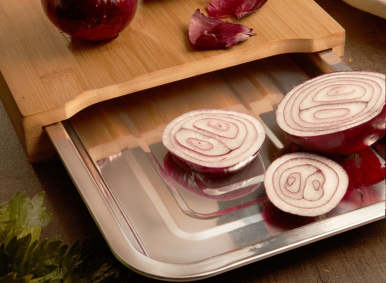 - Die herausnehmbare Schale unter dem Schneidebrett spart Platz und ermöglicht die sofortige Entsorgung von Abfällen – das spart Zeit und hält die Arbeitsfläche sauber.