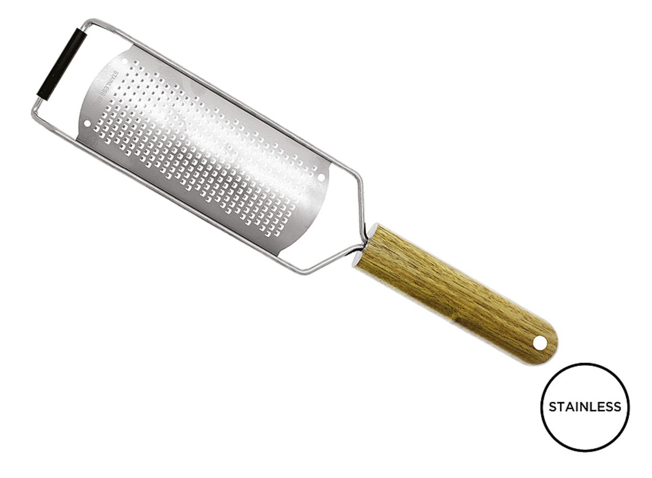 Reibefläche: 11 x 4,5 cm bei einer Dicke von 0,8 mm. Hergestellt aus lebensmittelechtem Edelstahl 304. Griff aus Akazienholz mit einem Rahmen aus Edelstahl 430. Schutzabdeckung aus Polypropylen und rutschfestem TPR.