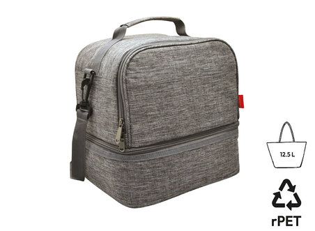 Thermotasche mit doppeltem Fach aus grau meliertem RPET- Wulongstoff. Maße des oberen Fachs: 25x20x16cm. Maße des unteren Fachs: 25x20x9cm. Kompatibel mit allen unseren Bento-Modellen. Isolierende 3mm dicke Auskleidung. Schultergurt. Möglichkeit eine Visitenkarte einzufügen. Verstärkte und gepolsterte Griffe für einen besseren Halt. Reißverschluss. Fassungsvermögen: 12,5 L.