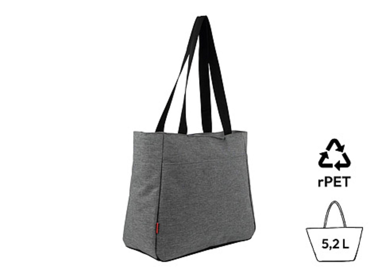 Insulated bag in heather grey wulong RPET fabric. Suitable for all our bento models. Additional Outer pocket. Reinforced handles. 5mm thick insulation. Zipped closure. Capacity: 20 L.