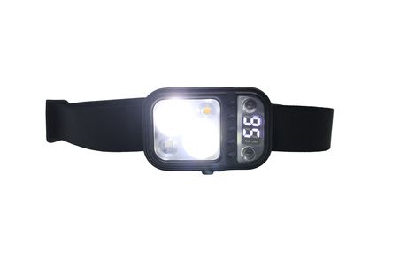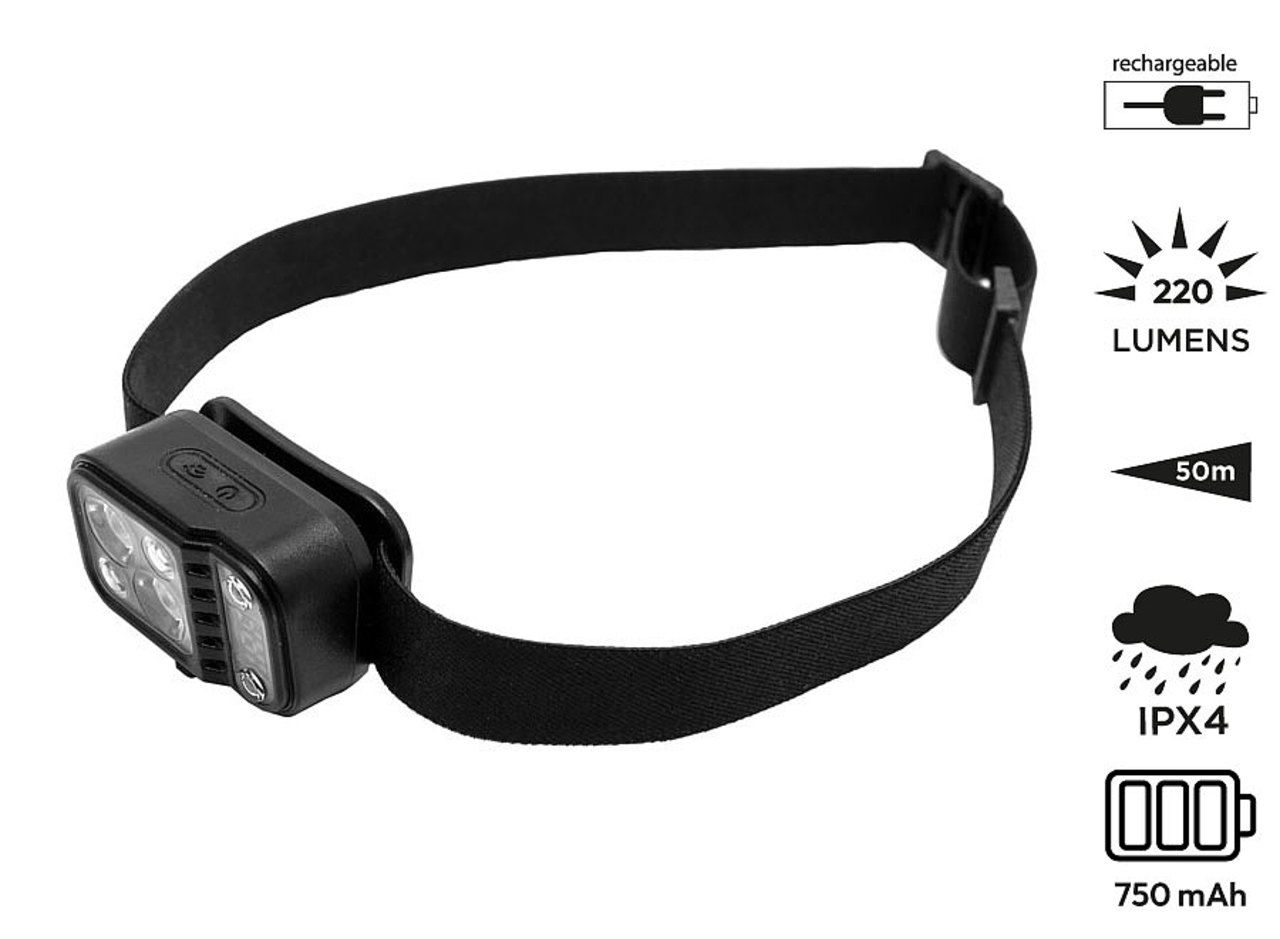 Headlight with 4 lighting modes: XPG LED (100% or 'Eco' mode), LED SMD (Warm light), or flashing red LED. Built-in motion sensor for contactless On/Off operations. Charging indicator in %. Adjustable lighting beam. ABS plastic case. Comfortable elastic band in soft touch. Works with a 750mAh rechargeable battery. USB-C charging cable included. XPG LED power: 5W (220 lumens). XPG LED beam distance: 50m. XPG LED autonomy: 2-4h. Waterproof level: IPX-4.