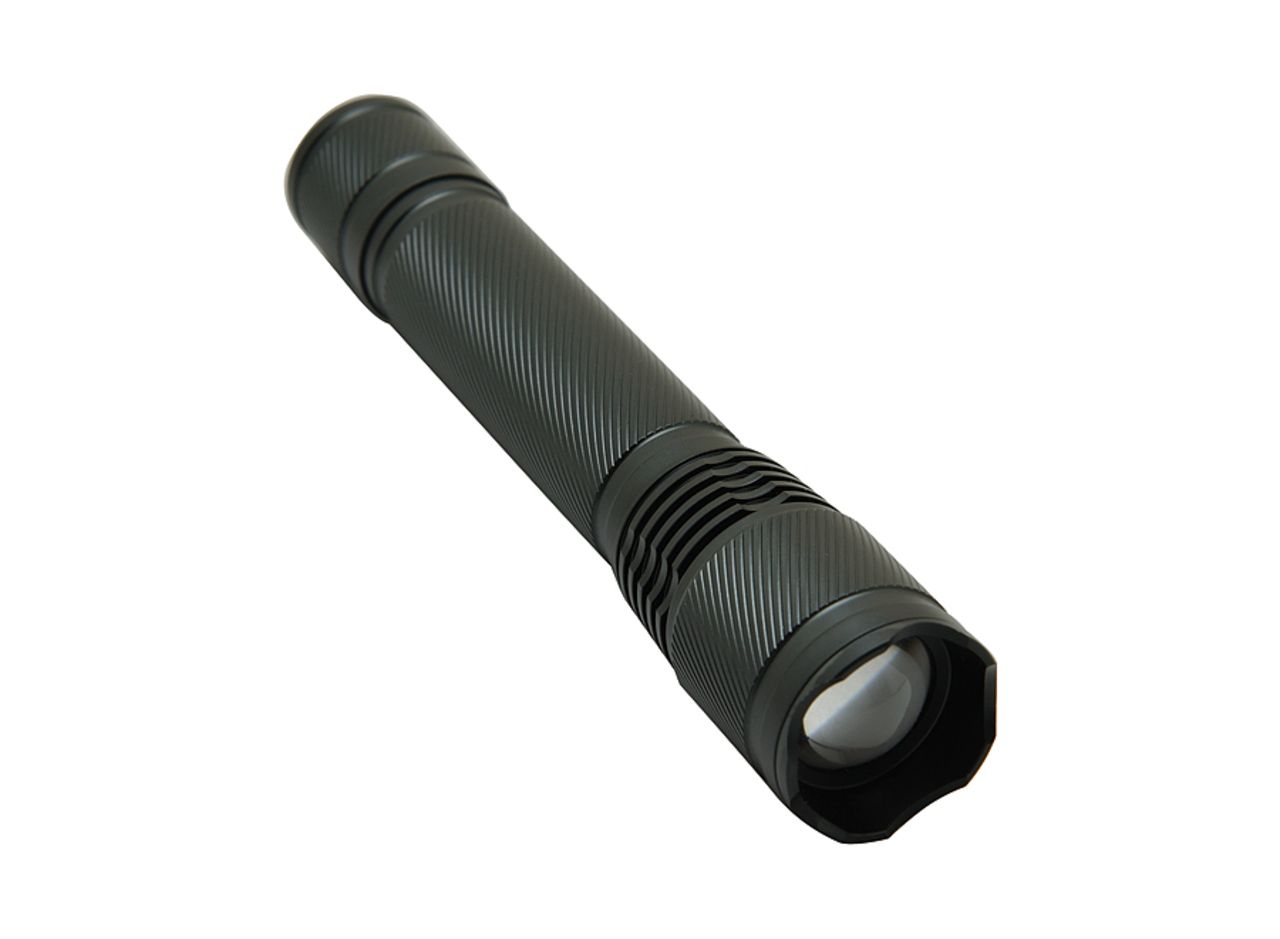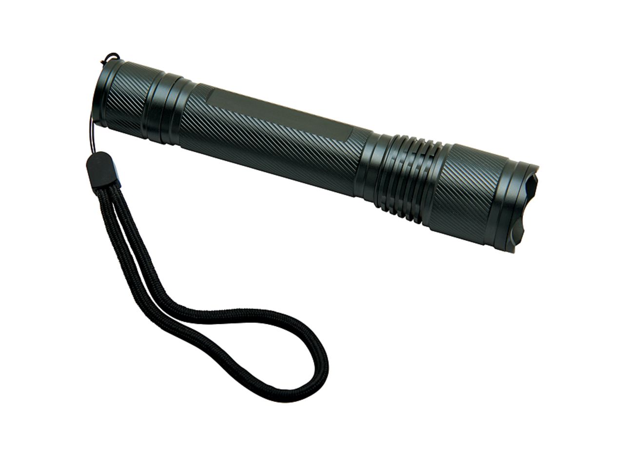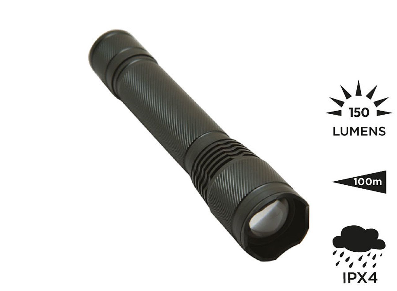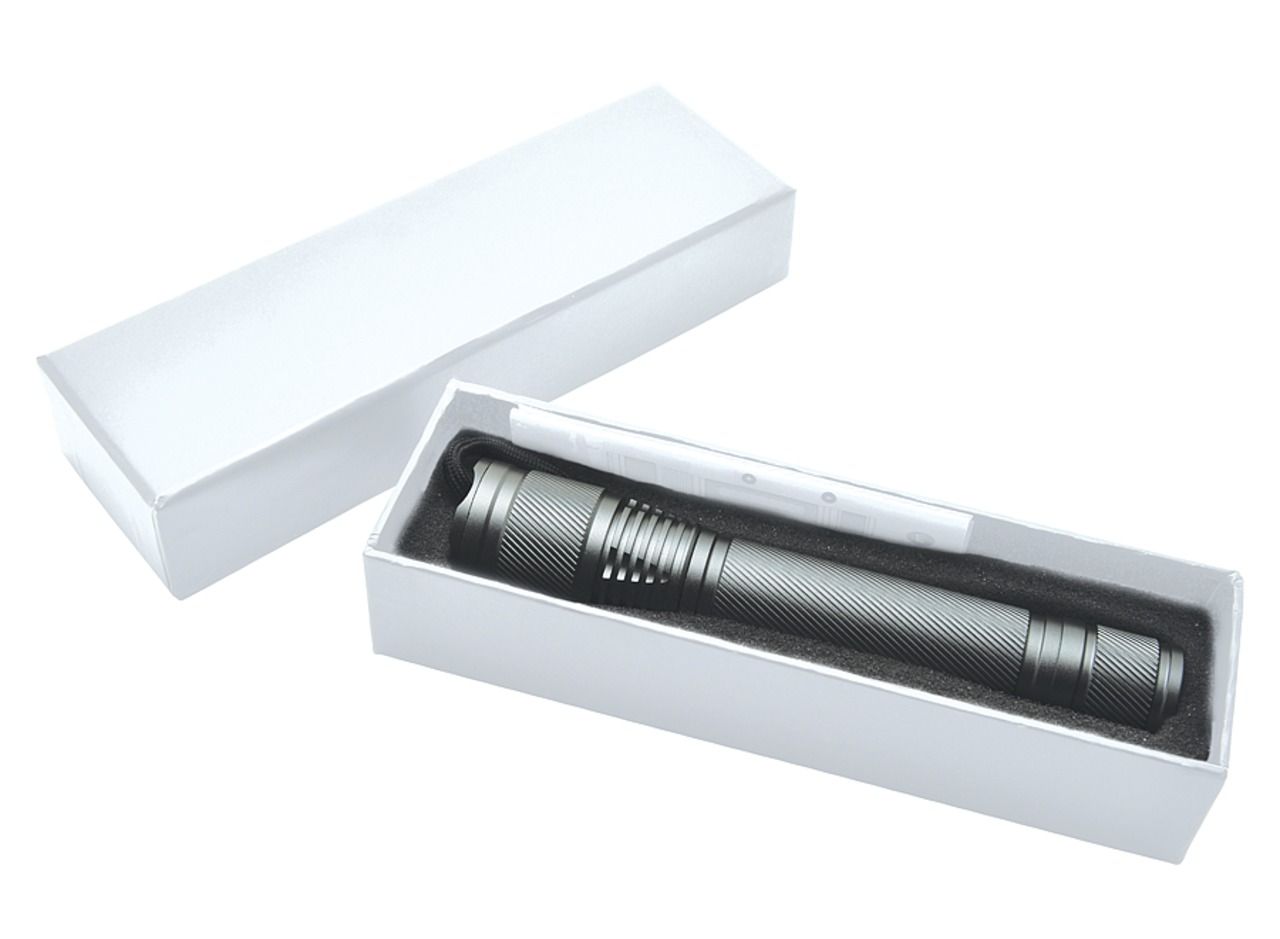 Anodized aluminium handle. 3W LED. Focus system allowing to increase the maximum beam distance by concentrating it. Seals on each screw thread for a higher waterproof level (do not immerse). On/Off button at the back of the torchlight. Works with 2 LR06 AA batteries (included). LED power: 3W (150 lumens). Beam distance: 100m. Waterproof level: IPX-4. Delivered in a carton gift box.