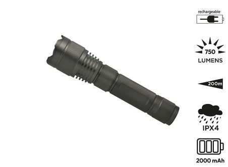 Anodized aluminium handle. 10W CREE XPE LED. 3 lighting modes (100%, 30% or flashing). Focus system allowing to increase the maximum beam distance by concentrating it. Seals on each screw thread for a higher waterproof level (do not immerse). On/Off button at the back of the torchlight. Works with a 2000 mAh rechargeable battery. Autonomy: 5h. Micro-USB charging cable included. LED power: 10W (750 lumens). Beam distance: 200m. Waterproof level: IPX-4. Delivered in a carton gift box.