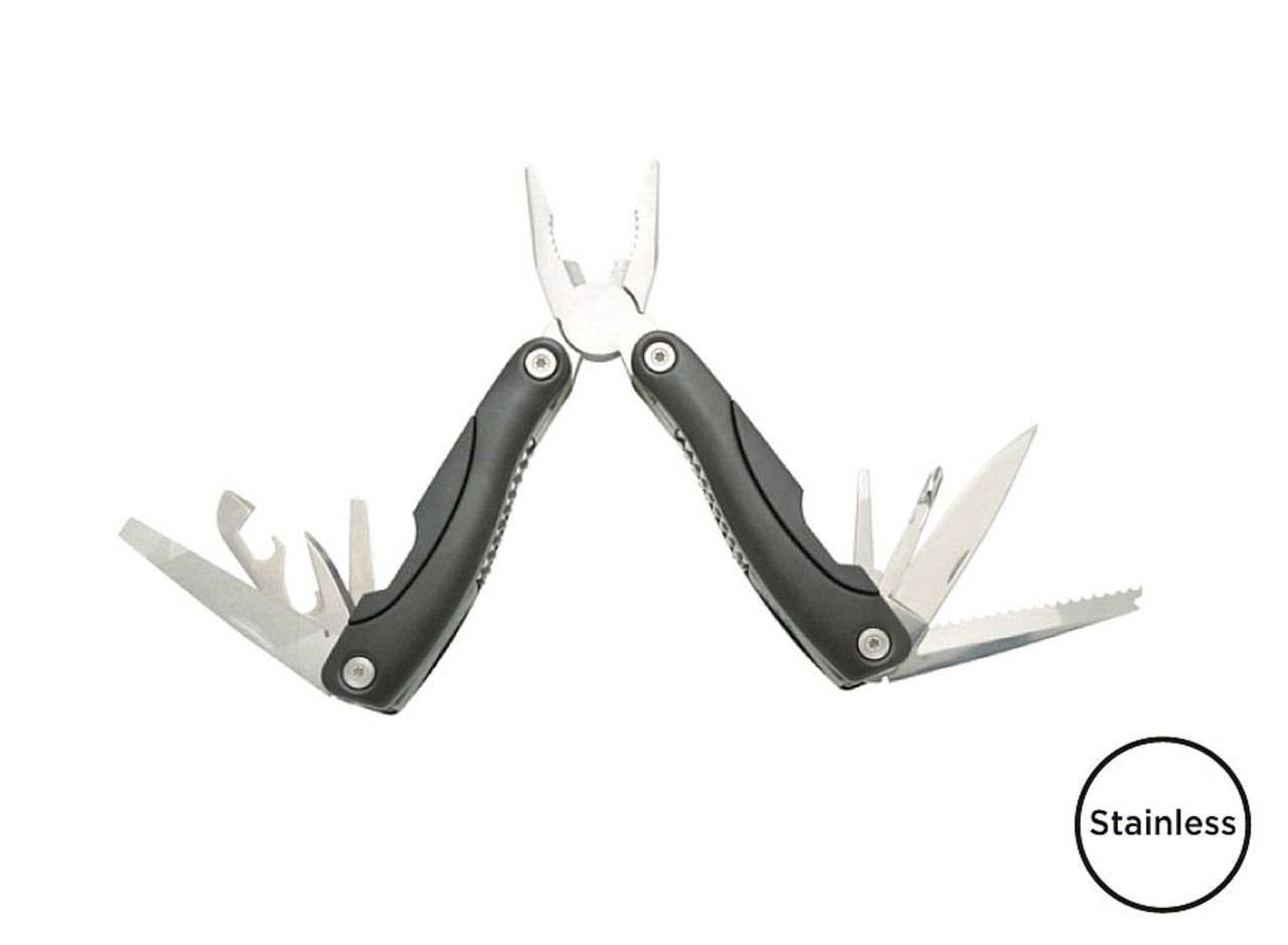 Professional multifunctional pliers made of highly resistant stainless steel (2CR13). Aluminium handle. New generation safety lock (easy unlocking). Torx screw assembly. 12 functions: universal pliers, cutting pliers, knife, saw, file, bottle opener, can opener, Phillips screwdriver, 3 sizes of flat screwdrivers, punch hole. Rockwell hardness: 48 degrees. Supplied with a black nylon belt pouch.