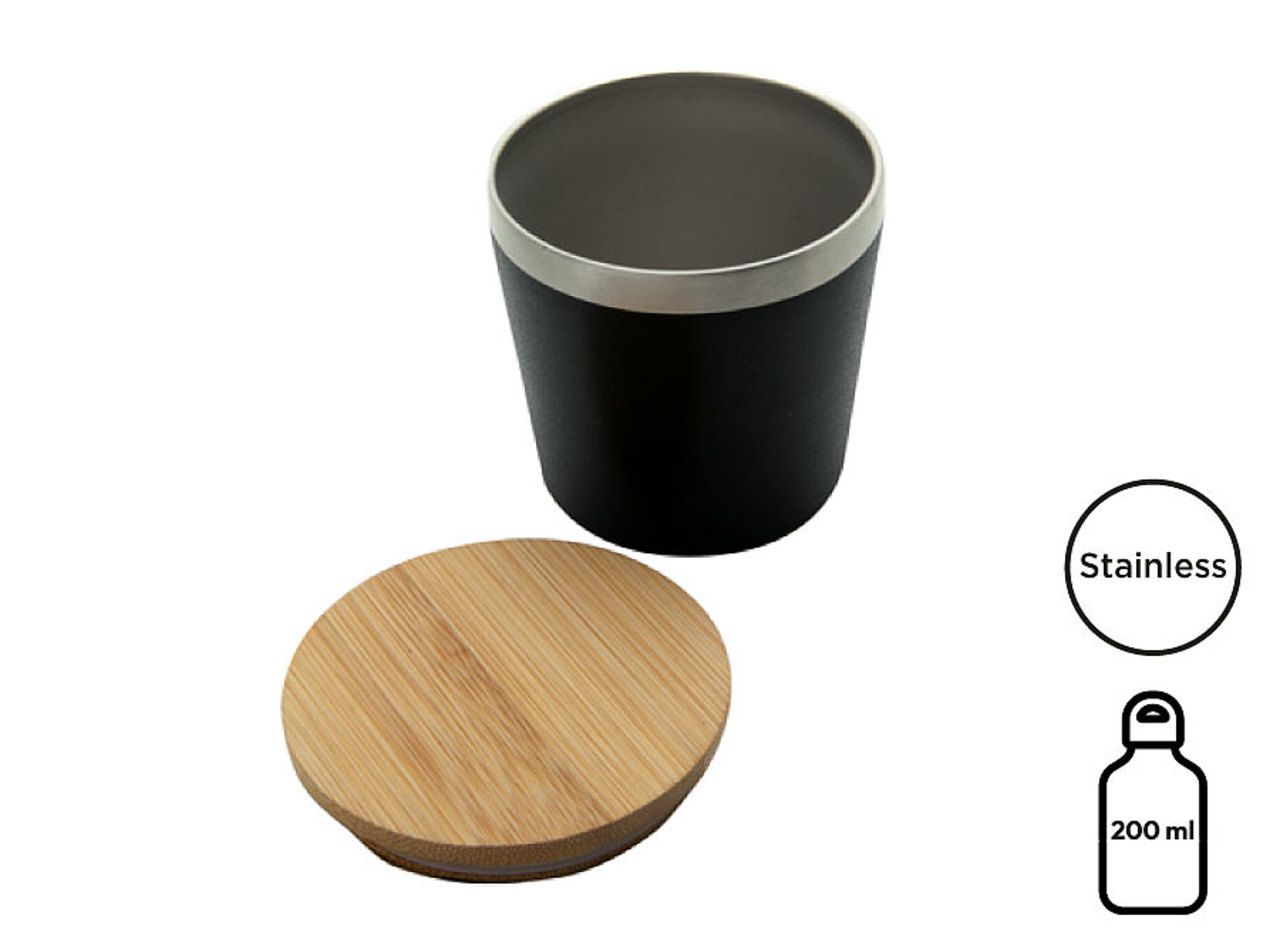 Double wall insulated 18/8 stainless steel compliant with food contact standards. Bamboo cap with a silicone seal. Capacity: 200 ml.