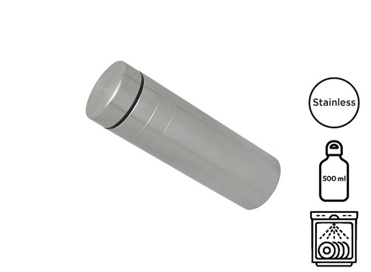 Double wall insulated 18/8 stainless steel compliant with food contact standards. Cap with a silicone seal. Without the cap, dishwasher safe (max 50°C). Space on the bottle for personalization with a PU leather label. Capacity: 500 ml.