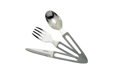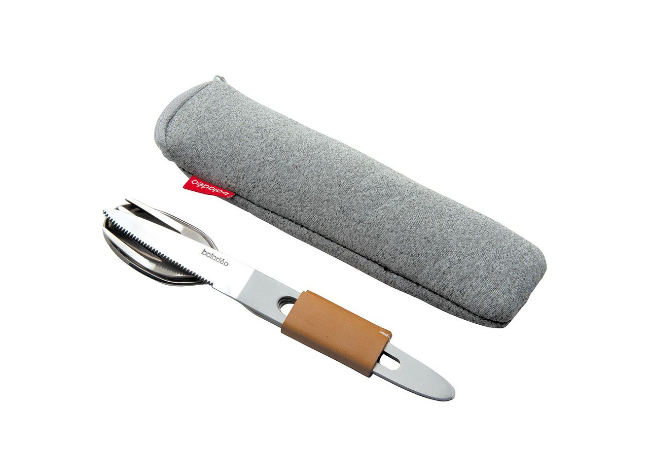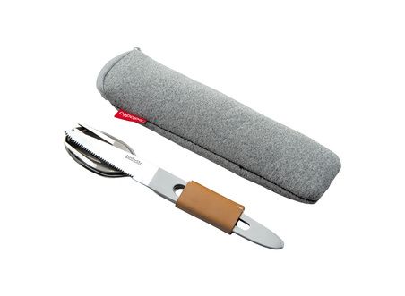 Food-grade 420 stainless steel travel cutlery set. Micro-serrated blade knife, fork, and spoon. Dishwasher safe. PU leather sheath and anthracite grey neoprene pouch included.