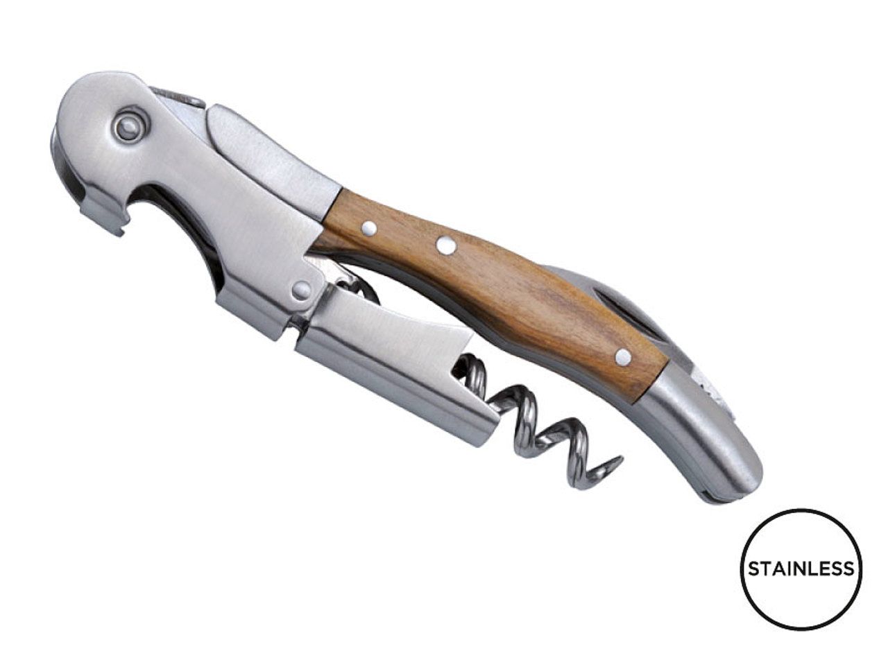 Professional two steps sommelier corkscrew. Ribbed olive wood handle. 2 forged stainless steel bolsters. 5 spirals stainless steel threaded corkscrew end. Micro-serrated lid cutter. Quick bottle opener. Delivered in a black carton gift box.