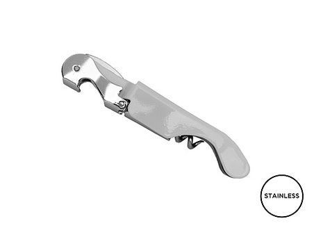 Professional two steps sommelier corkscrew. Stainless steel handle. 5 spirals stainless steel corkscrew end. Micro-serrated lid cutter. Quick bottle opener.