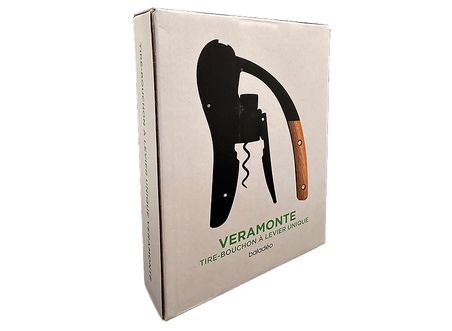 Zinc alloy structure coated with ABS offering a soft-touch rubber finish. Handle tip made of acacia wood. Stainless steel corkscrew end with a black non-stick coating. Dual support notches on the bottleneck, with a spring-loaded clamping handle and grippy inner coating. Rocking mechanism for smooth opening. Integrated lid cutter.