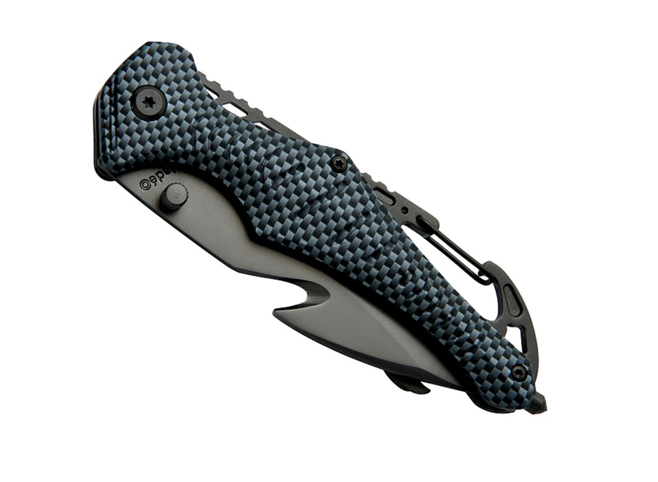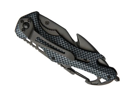 - Seat belt cutter with razor sharpening and window breaker in tugnsten carbide on this rescue knife for emergency situations.