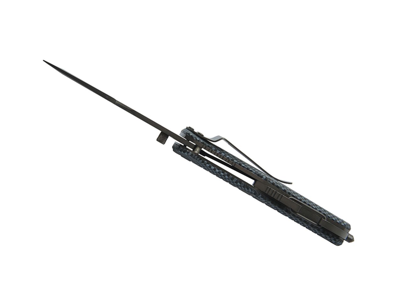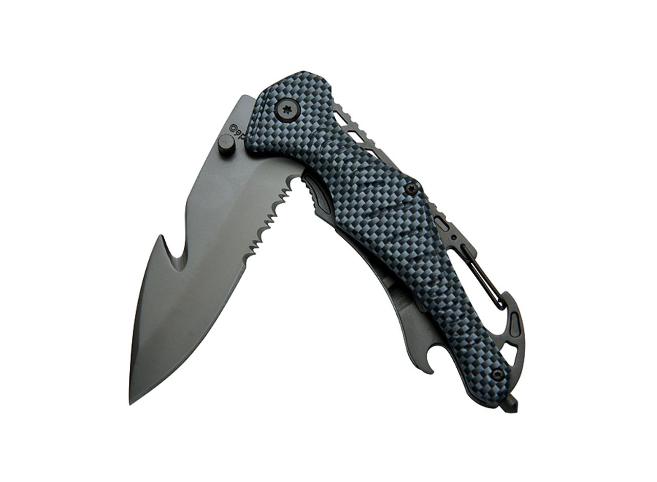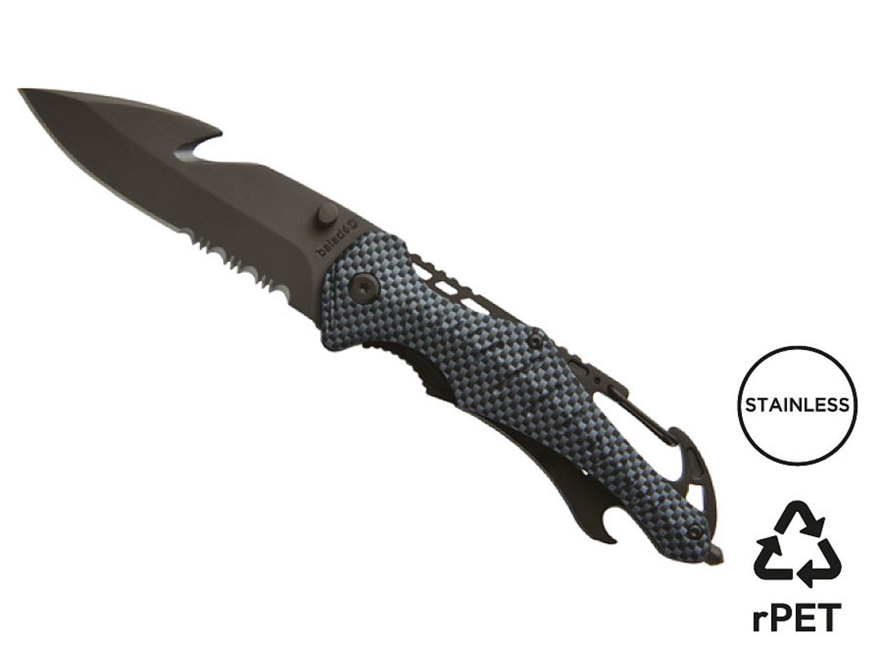 Folding pocket knife with a 420 stainless steel blade with titanium coating. Blade with a fine part (for precision cutting) and a micro-serrated part (for heavy duty task). Anodized aluminium handle in a carbon fiber style. One-handed opening/closing with a Liner lock safety system. Torx screw assembly. Seat belt cutter on the blade and window breaker hammer functions in tungsten carbide at the back of the handle. Bottle opener, carabiner and belt clip. Heather grey RPET pouch included.