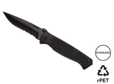 Folding knife with a black 420 stainless steel blade. Blade with a fine part (for precision cutting) and a micro-serrated part (for heavy duty task). ABS handle with rubber insert. One-handed opening/closing with a Liner lock safety system. Hole for cord at the back of the handle. Belt clip. Heather grey RPET pouch included.