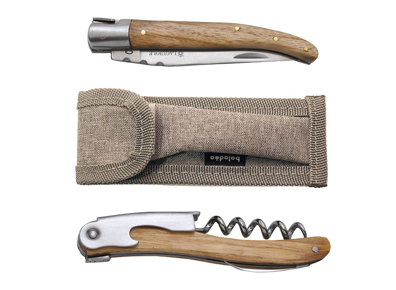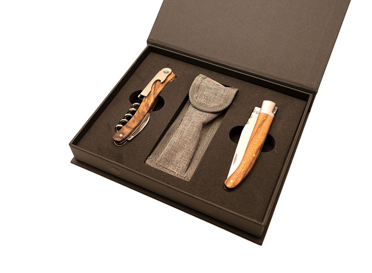Gift set with a 11cm folding pocket knife and a professional waiter's corkscrew. Zebrawood handles.