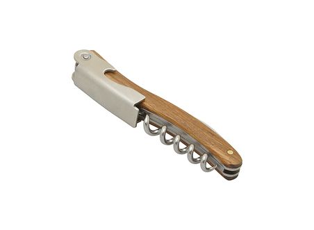 Professional sommelier corkscrew with a 5 spirals stainless steel corkscrew end, a micro-serrated lid cutter and a bottle opener.