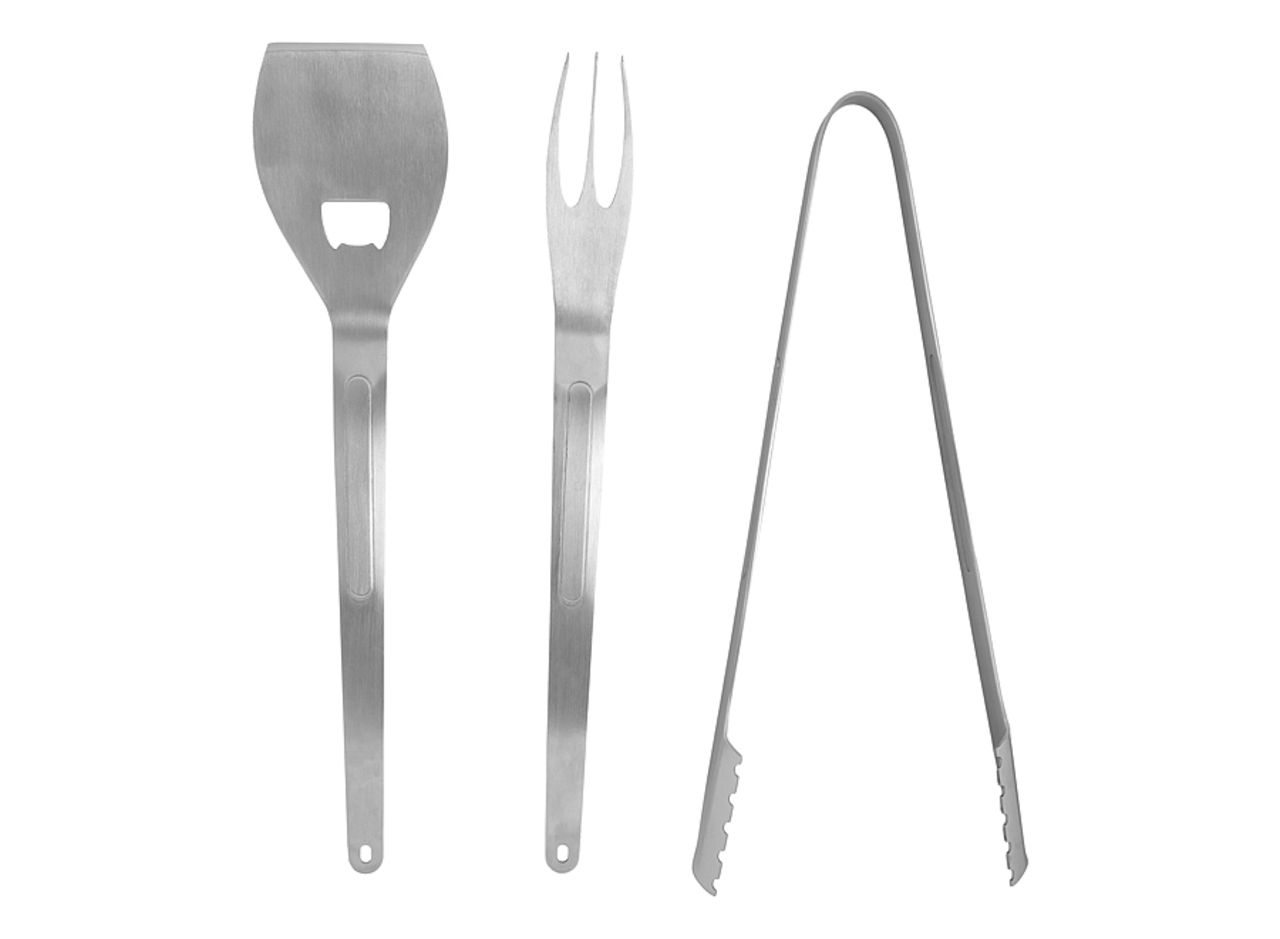 Complete set of 3 BBQ cutlery in food-grade 430 stainless steel (Ferritic in accordance with the decree of January 13, 1976) blade with tongs, a spatula and a fork. Length of each element: 34,50cm. Dishwasher safe. Heather grey RPET roll-up storage included.