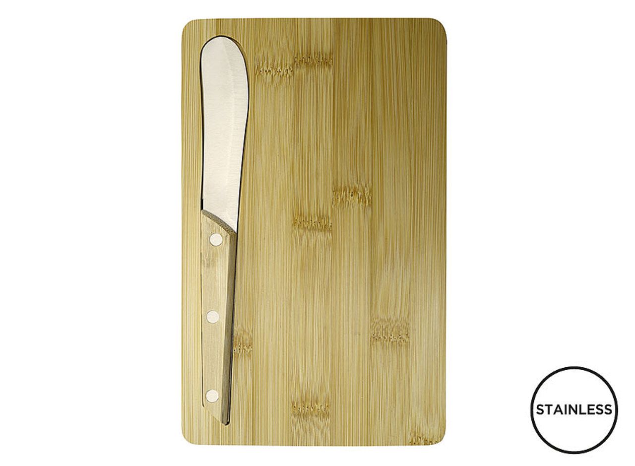 Bamboo. Delivered with a spreader knife in food-grade 420 stainless steel blade with satin finish. Fine blade micro-serration. Bamboo handle. Slot on the board for this spreader knife also called butter knife.