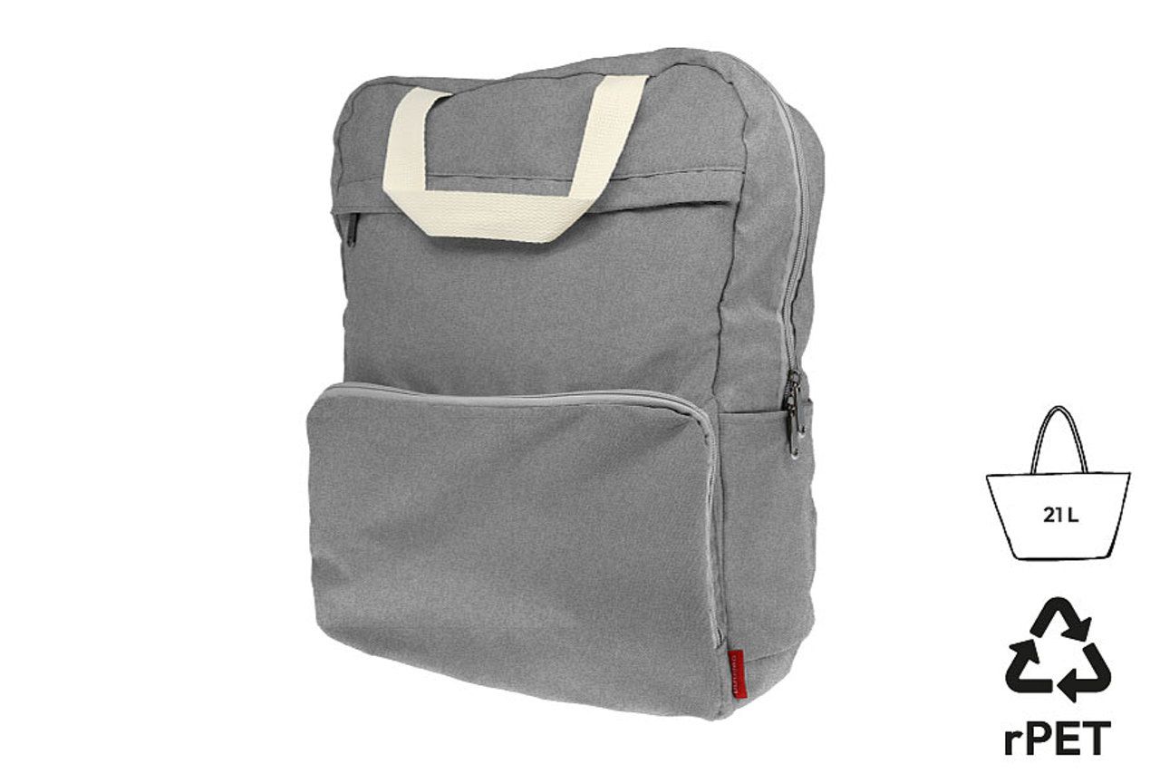 In heather grey wulong RPET fabric weighing 130g/m². 3 storage spaces with zipped closure. 2 additional pockets on the sides. Adjustable and padded shoulder straps. Handles and shoulder strap ends in cotton twill. Size of the bag when folded: 28x18x2,5cm. Capacity: 21 L.