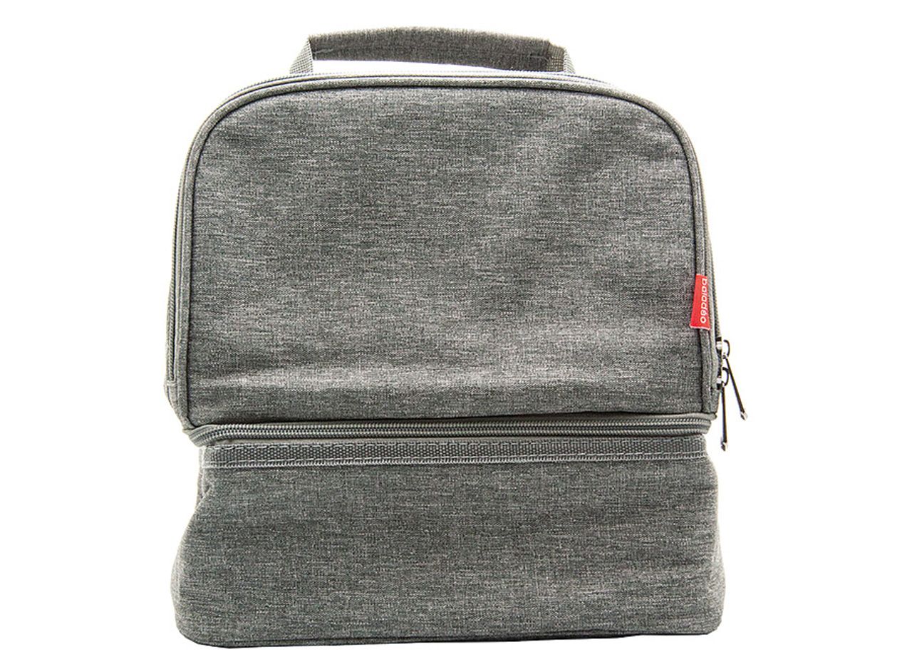 Double compartment insulated bag in heather grey RPET fabric. Size of the upper compartment: 25x20x16cm. Size of the lower compartment: 25x20x9cm. Suitable for all our bento models. 3mm thick insulation. Shoulder strap. Possibility to insert a business card. Reinforced and padded handles for a better grip. Zipped closure. Capacity: 12,5 L.