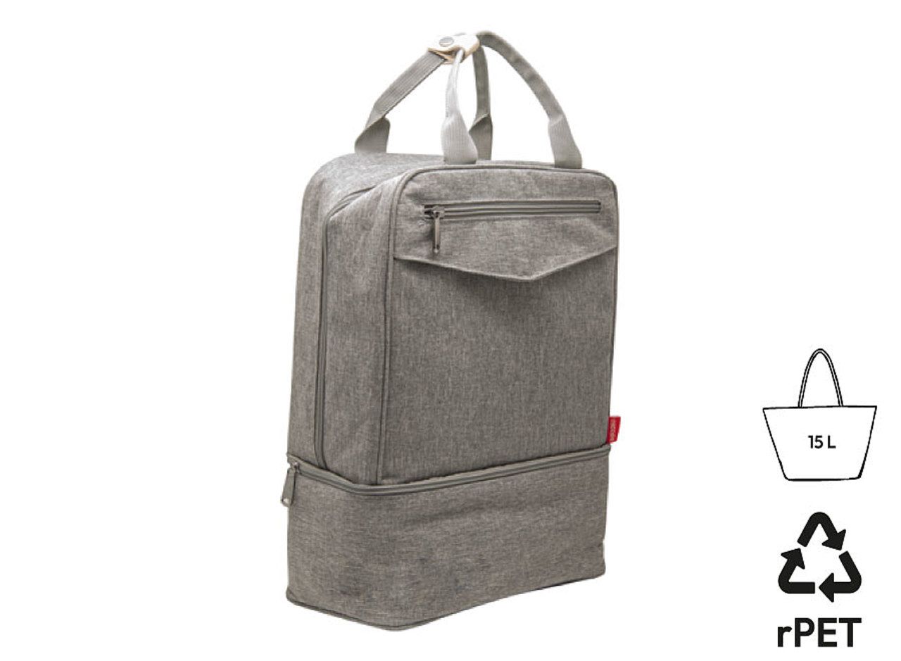 Double compartment insulated backpack in heather grey RPET fabric. Aluminium interior. Suitable for all our bento models. 3mm thick insulation covered with aluminium foil. Zipped closure. Capacity: 15 L.