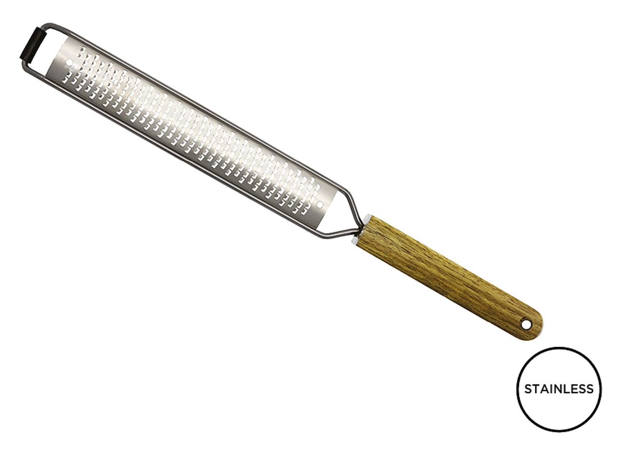 Surface de râpe de 15,4 x 2,3cm avec 0,8mm d'épaisseur. Acier inoxydable 304 à usage alimentaire. Manche en acacia avec structure en acier inoxydable 430. Couvercle de protection en polypropylène et antidérapant en TPR.