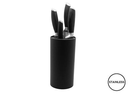 Lames en acier inoxydable 13/0 avec finition satinée. Un couteau Santoku (lame de 16,5cm), un couteau à trancher (lame de 19cm), un couteau à pain (lame de 20cm) et un couteau universel (lame de 12cm). Manches en acier 18/0 avec touché gomme. Livrés dans un bloc de rangement universel avec tiges "spaghetti".