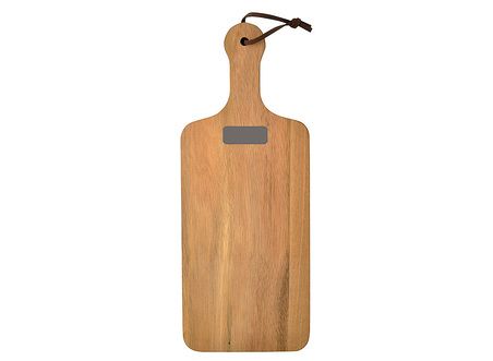 Acacia massif. Plaque en métal finition titane. Lien en similicuir. Peut aussi servir comme planche de présentation.