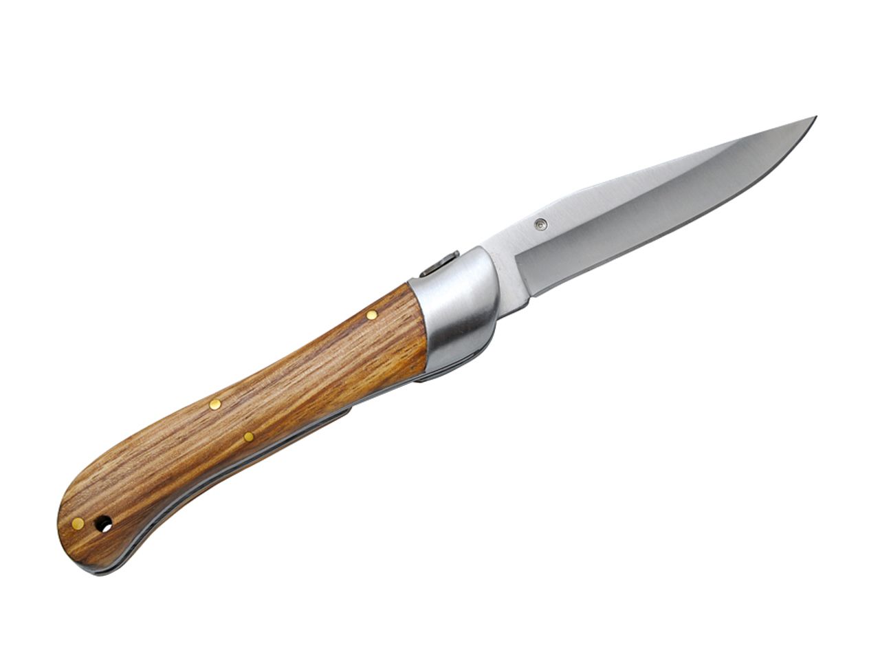 Couteau de poche pliant avec lame en acier inoxydable 420. Manche en frêne exotique. Ressort guilloché. Mitre forgée en acier brossé inoxydable. Ouverture/fermeture une main avec cran de sécurité de type Liner lock. Livré dans un étui de ceinture en nylon 420D gris chiné.
