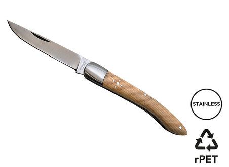 Couteau pliant réalisé d'après un cahier des charges très strict : Lame en acier inoxydable 440, dit 'acier chirurgical'. C'est le parfait compromis entre le chrome (qui protège de la rouille) et le carbone (qui garantit le tranchant). Lame affûtée 'rasoir'. Manche en bois d'olivier nervuré. Ressort guilloché. Deux mitres pleines en acier inoxydable forgées. Livré dans un étui gris chiné en RPET.