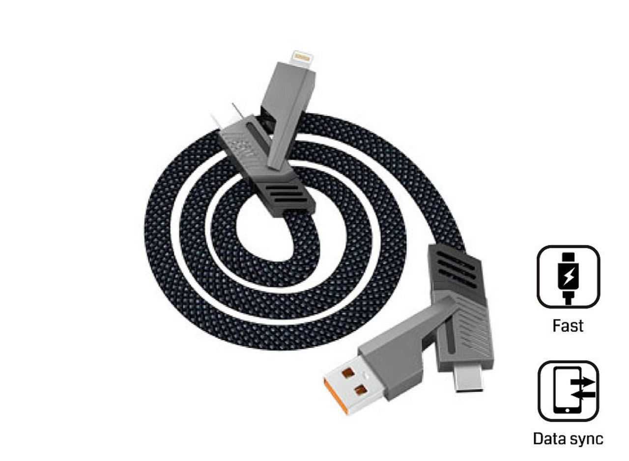 4 connectiques en 1 pour ce câble universel permettant de charger depuis des prises USB-A ou USB-C vers des prises USB-C ou Lightning. Charge rapide (60W max) et transfert de données USB 2.0 avec débit de transmission de 480Mbps. Structure en nylon et câble en cuivre. Attache en velcro incluse. Longueur : 1m.