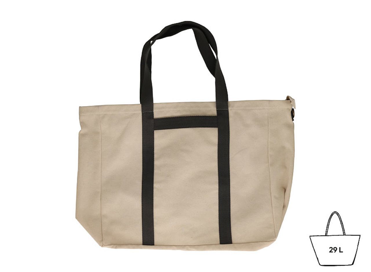 Grand sac ultra-résistant et élégant en 100% coton toile de 454g/m². Fermeture zippée. Coutures superposées renforcées et liées. 3 poches intérieures et 1 poche extérieure. Pochette zippée intérieure amovible avec un mousqueton métallique. Doublure imprimée de 145g/m². Anses et bandoulière détachable en coton sergé. Astucieux espace au dos du sac spécialement conçu pour transporter un tapis de yoga, une veste ou autre sans utiliser l'espace intérieur. Contenance : 29 L.