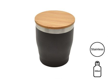 Double paroi isotherme en acier inoxydable 18/8 conforme aux normes de contact alimentaire. Couvercle en bambou avec joint en silicone. Contenance : 330 ml.