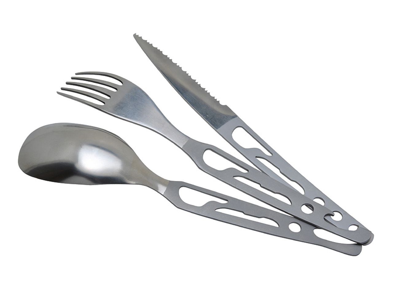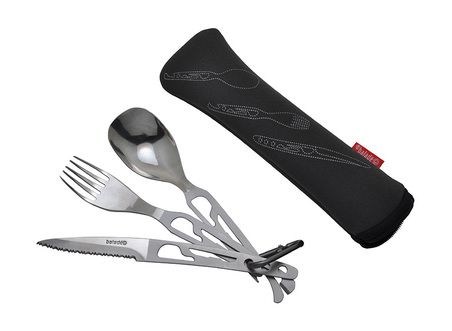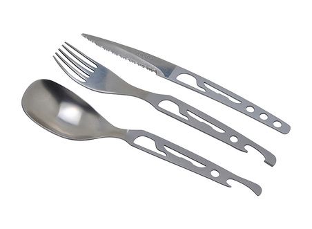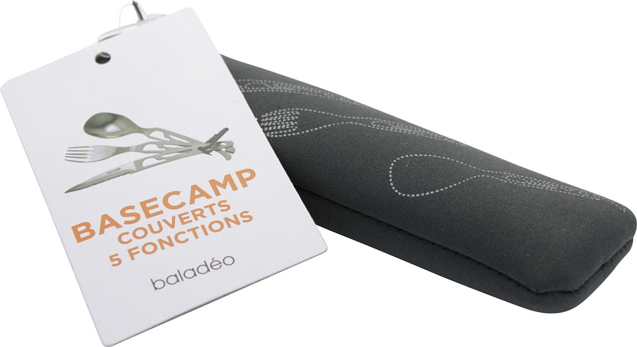 Couverts de voyage en acier inoxydable 420 alimentaire. 5 fonctions : couteau avec lame microdentée, fourchette, cuillère, décapsuleur, ouvre boite. Passe au lave-vaisselle. Livrés avec un mousqueton en aluminium dans une housse en néoprène gris anthracite.